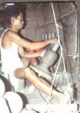 Kiri : Membentuk badan gerabah dengan alat putar tradisional dengan tenaga gerak kaki, alat ini di Bali disebut dengan pengenyunan