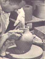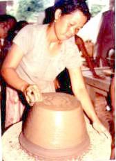Kanan : Membentuk badan gerabah dengan alat putar tangan tradisional