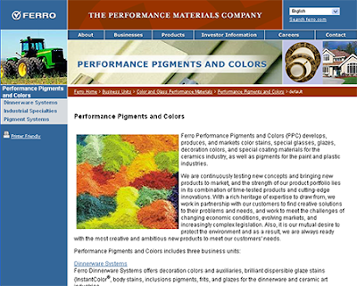 Ferro Performance Pigments and Colors (PPC) develops, produces, and markets color stains, special glasses, glazes, decoration colors, and special coating materials for the ceramics industry, as well as pigments for the paint and plastic industries.